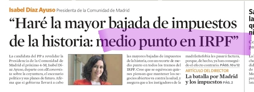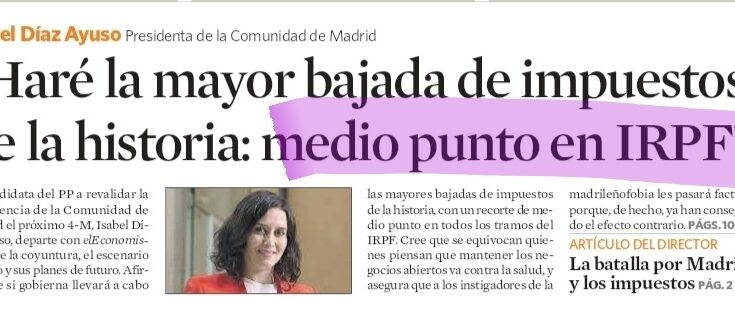 Ayuso se cree que es muy liberal y que está haciendo grandes reformas, pero no se da cuenta de que todo lo que dice es absurdo. Porque bajar el IRPF medio punto tiene de bajada de impuestos lo que yo de chino mandarín. Y si dice que no tiene competencia para hacerlo que lo bonifica el 100%, como hizo en otro tiempo la Comunidad de Madrid con el Impuesto sobre Sucesiones. Eso es una bajada de impuestos.
