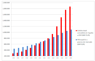 Estremece la lectura atenta de la carta que el 26 de mayo de 2006 envió la Asociación de Inspectores del Banco de España al negligente Solbes, entonces Vicepresidente del Gobierno de Zapatero (PSOE) quejándose de la actitud del Gobernador del Banco de España Sr. Caruana (PP) respecto de la crisis financiera por llegar. Es muy significativa la fecha (2006), anterior en un año al comienzo de la crisis de liquidez (17 de agosto de 2007). Resulta profética y muy acertada, incluso temporalmente, la intervención de la referida asociación. Incluso respecto de sus efectos para las familias. El texto íntegro puede encontrarse en otras webs. La denuncia de los Inspectores, hecha en momento del todo tempestivo, convierte a Caruana y a Rato en políticamente responsables de la situación actual y por tanto al PP. Para ser del todo justos, se ha de añadir que el incremento del crédito con el nefasto MAFO, que por divino castigo sigue siendo Gobernador, y por tanto con el PSOE de Zapatero, ha sido aún mayor. Son temas ya tratados antes (véase «España Subprime«) y puede verse en el gráfico siguiente: