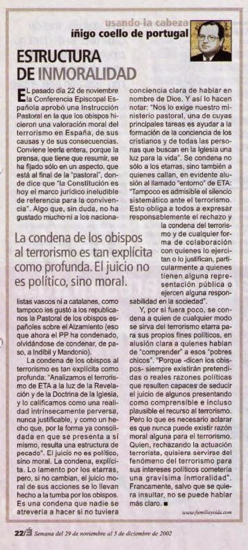 El pasado día 22 de noviembre la Conferencia Episcopal Española aprobó una Instrucción Pastoral en la que los Obispos hicieron una valoración moral del terrorismo en España, de sus causas y de sus consecuencias. Conviene leerla entera, porque la Prensa, que tiene que resumir, se ha fijado sólo en un aspecto, que está al final de la “pastoral”, donde dice que “la Constitución es hoy el marco jurídico ineludible de referencia para la convivencia”. Algo que, sin duda, no ha gustado mucho ni a los nacionalistas vascos ni a catalanes, como tampoco les gustó a los republicanos la Pastoral de los Obispos españoles sobre el Alzamiento (eso que ahora el PP ha condenado, olvidándose de condenar, de paso, a Indíbil y Mandonio). La condena de los Obispos al terrorismo es tan explícita como profunda: “Analizamos el terrorismo de ETA a la luz de la Revelación y de la Doctrina de la Iglesia, y lo calificamos como una realidad intrínsecamente perversa, nunca justificable, y como un hecho que, por la forma ya consolidada en que se presenta a sí mismo, resulta una estructura de pecado”. El juicio no es político, sino moral. La condena, explícita. Lo lamento por los etarras, pero, si no cambian, el juicio moral de sus acciones se lo llevan hecho a la tumba por los Obispos. Es una condena que nadie se atrevería a hacer si no tuviera conciencia clara de hablar en nombre de Dios. Y así lo hacen notar: “nos lo exige nuestro ministerio pastoral, una de cuyas principales tareas es ayudar a la formación de la conciencia de los cristianos y de todas las personas que buscan en la Iglesia una luz para la vida”. Se condena no sólo a los etarras, sino también a quienes callan, en evidente alusión al llamado “entorno” de ETA: “tampoco es admisible el silencio sistemático ante el terrorismo. Esto obliga a todos a expresar responsablemente el rechazo y la condena del terrorismo y de cualquier forma de colaboración con quienes lo ejercitan o lo justifican, particularmente a quienes tienen alguna representación pública o ejercen alguna responsabilidad en la sociedad”. Y, por si fuera poco, se condena a quien de cualquier modo se sirva del terrorismo etarra para sus propios fines políticos, en alusión clara a quienes hablan de “comprender” a esos “pobres chicos”. Porque -dicen los Obispos- “siempre existirán pretendidas o reales razones políticas que resulten capaces de seducir el juicio de algunos presentando como comprensible e incluso plausible el recurso al terrorismo. Pero lo que es necesario aclarar es que nunca puede existir razón moral alguna para el terrorismo. Quien, rechazando la actuación terrorista, quisiera servirse del fenómeno del terrorismo para sus intereses políticos cometería una gravísima inmoralidad”. Francamente, salvo que se quiera insultar, no se puede hablar más claro.