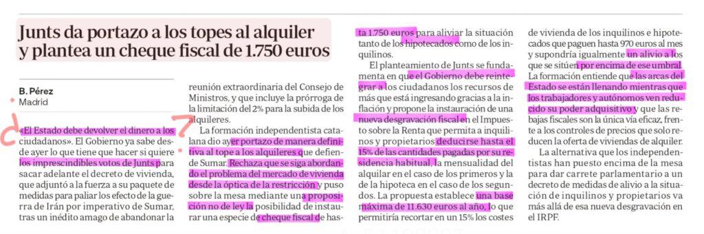 Pues bien, Junts se ha apuntado al socialismo. Lo que propone no es bajar los impuestos. Lo que propone es seguir cobrando muchos impuestos y luego controlar a la población y, en particular, controlar sus votos, garantizándose que éstos votarán a Junts, utilizando el presupuesto para deducciones en el impuesto sobre la renta y de esa manera garantizarse que les votarán. No se bajan los impuestos, sino que se incrementan las deducciones y, de esa manera, para obtener una deducción, hay que votar a Junts.