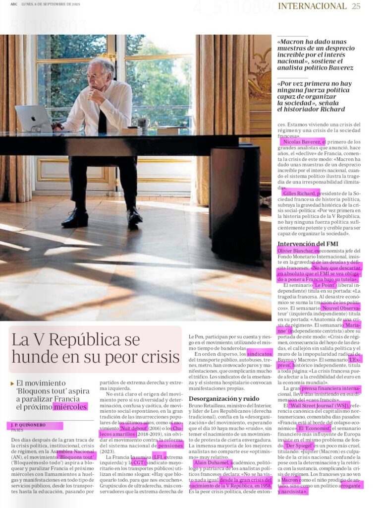 El próximo miércoles Francia se hundirá en su propia miseria insumisa. Ya no saben cómo pagar el socialismo. Son los sindicatos. Son los partidos de izquierda. Son los partidos de derecha. Es el Fondo Monetario Internacional (FMI, IMF). No lo digo sólo yo. Lo dice la prensa internacional y la prensa nacional francesa: L’Express, Le Nouvel Observateur, Marianne… Son sus propios analistas políticos (Duhamel, Baverez, Richard, Blanchar…) los que tildan al masón que tienen por presidente como narcisista y arrogante. Todos califican esta crisis como la que dio lugar a la Quinta República en 1958. Pero recuerden una cosa: les falta De Gaulle. Francia es un problema descomunal para la Unión Europea y para la estabilidad del euro, y tiene que ser intervenida. Cuanto más tarde, peor. El miércoles lo comprobarán. Lean la crónica de Juan Pedro Quiñonero en el ABC.