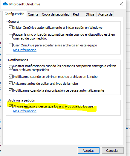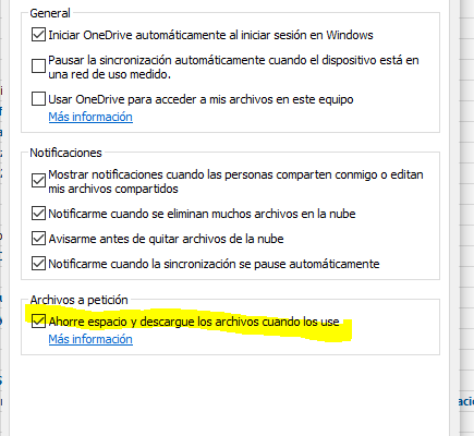 Microsoft ha decidido que en sus nuevas actualizadiones de Windows 10 todos los usuarios de One Drive, que somos millones, tenemos prohibido guardar nuestros archivos en nuestro ordenador y ordena que los guardemos en su nube por un procedimiento sencillo: impide que el almacenamiento sea simultáneamente local y remoto. Véalo en la imagen.
