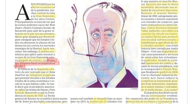 Pedro Schwartz en el ABC de hoy revela como esto es pura falacia y que las soluciones económicas que sean de seguir en etapas de crisis son precisamente las contrarias a las que utilizo Roosevelt.