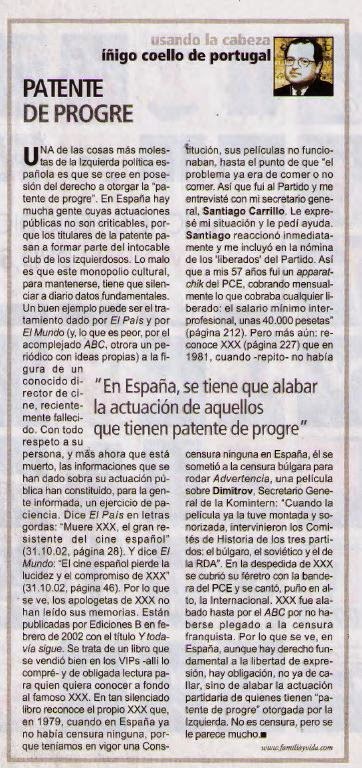 Una de las cosas más molestas de la Izquierda política española es que se cree en posesión del derecho a otorgar la “patente de progre”. En España hay mucha gente cuyas actuaciones públicas no son criticables, porque los titulares de la patente pasan a formar parte del intocable “club” de los izquierdosos. Lo malo es que este monopolio cultural, para mantenerse, tiene que silenciar a diario datos fundamentales. Un buen ejemplo puede ser el tratamiento dado por “El País” y por “El Mundo” (y, lo que es peor, por el acomplejado «ABC», otrora un periódico con ideas propias) a la figura de un conocido director de cine, recientemente fallecido. Con todo respeto a su persona, y más ahora que está muerto, las informaciones que se han dado sobra su actuación pública han constituido, para la gente informada, un ejercicio de paciencia. Dice “El País” en letras gordas: “Muere XXX, el gran resistente del cine español” (31.10.02, página 28). Y dice “El Mundo”: “el cine español pierde la lucidez y el compromiso de XXX” (31.10.02, página 46). Por lo que se ve, los apologetas de XXX no han leído sus Memorias. Están publicadas por “Ediciones B” en febrero de 2002 con el título “Y todavía sigue”. Se trata de un libro que se vendió bien en los VIPs -allí lo compré- y de obligada lectura para quien quiera conocer a fondo al famoso XXX. En tan silenciado libro reconoce el propio XXX que, en 1979, cuando en España ya no había censura ninguna, porque teníamos en vigor una Constitución, sus películas no funcionaban, hasta el punto de que “el problema ya era de comer o no comer. Así que fui al Partido y me entrevisté con mi secretario general, Santiago Carrillo. Le expresé mi situación y le pedí ayuda. Santiago reaccionó inmediatamente y me incluyó en la nómina de los ‘liberados’ del Partido. Así que a mis 57 años fui un apparatchik del PCE, cobrando mensualmente lo que cobraba cualquier liberado: el salario mínimo interprofesional, unas 40.000 pesetas” (página 212). Pero más aún: reconoce XXX (página 227) que en 1981, cuando -repito- no había censura ninguna en España, él se sometió a la censura búlgara para rodar “Advertencia”, una película sobre Dimitrov, Secretario General de la Komintern: “cuando la película ya la tuve montada y sonorizada, intervinieron los Comités de Historia de los tres partidos: el búlgaro, el soviético y el de la RDA”. En la despedida de XXX se cubrió su féretro con la bandera del PCE y se cantó, puño en alto, la Internacional. XXX fue alabado hasta por el ABC por no haberse plegado a la censura franquista. Por lo que se ve, en España, aunque hay derecho fundamental a la libertad de expresión, hay obligación, no ya de callar, sino de alabar la actuación partidaria de quienes tienen “patente de progre” otorgada por la Izquierda. No es censura, pero se le parece mucho.