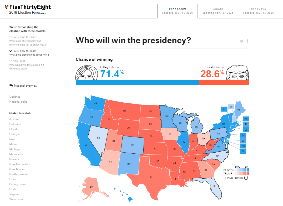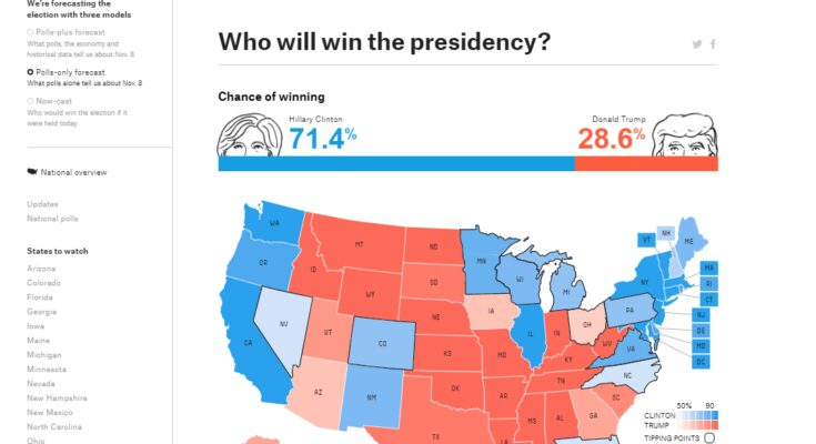 El 8 de noviembre de 2016 las encuestas estadounidenses atribuían a Hilaria Clinton el 71,4 por ciento de oportunidades de ganar y a Trump el 28,6 por ciento. Hoy las encuestas de la misma web le dan a Trump un 13%: